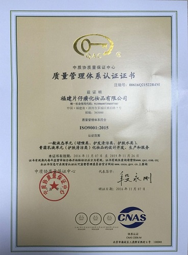 近日,经过了中质协质量保证中心一系列严格的审查和考核,福建片仔癀化妆品有限公司正式通过了ISO90012015新版国际质量管理体系认证,标志着片仔癀化妆品在提升商品质量、服务质量等方面再上一个新的台阶!