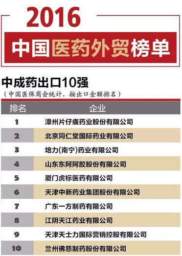 2017年2月20日,中国医药保健品进出口商会2016年度中国医药外贸十强榜单出炉,漳州片仔癀药业股份有限公司蝉联年度中国中成药行业出口首位。