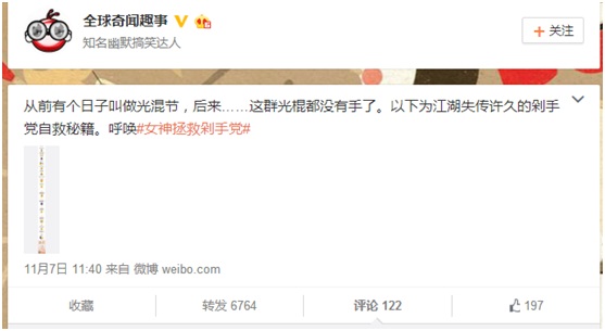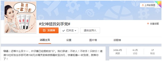 片仔癀化妆品在微博这个中国最重要的基于用户兴趣与开放关系的社交媒体平台进行话题营销,首先,选择话题很重要,一个有噱头紧贴热点的话题往往能引来众多粉丝的关注和讨论。双十一即将到来,如何将活动与热点紧密结合,实现活动与品牌的最大化曝光,引发网友的关注,是片仔癀化妆品此次微博营销成败的重中之重。双十一又称光棍节,“女神”二字本身自带吸粉魔力,“剁手党”这个话题自兴起后,便一年一唱,几乎成为惯例,如何在双十一管住自己的手,是很多人极为关注的一大热点。“女神”和“剁手党”同时抓住网友的痛点,此话题不火也难。