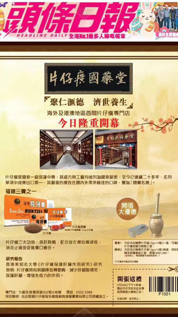 2018年3月28日,海外及港澳地区首间片仔癀国药堂隆重开幕。片仔癀国药堂位于香港九龙佐敦弥敦道302号A地铺,秉承“聚仁汇德,济世养生”的理念,以保证正品为原则,以让更多港人认识和服用片仔癀为目标而开设。受公司领导委托,药业公司洪绯总工、黄军英助总及张泽修主任参加开业庆典。受邀参加开业庆典的嘉宾有:漳龙实业有限公司颜生活董事长,香港漳州同乡会郑亚玲女士、华闽(集团)有限公司总经理丁炳华先生、香港“小巴大王”马亚木先生,当日,香港《头条日报》亦在头版头条刊登了片仔癀国药堂隆重开业的喜讯,为香港片仔癀国药堂的开幕宣传造势。