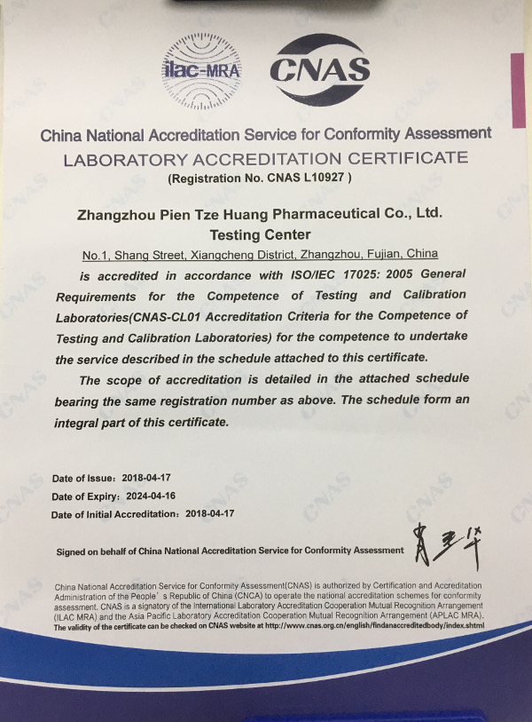 2018年4月17日,漳州片仔癀药业股份有限公司检测中心成功获得由中国合格评定国家认可委员会(CNAS)颁发的实验室认可证书,正式通过国家实验室认可。