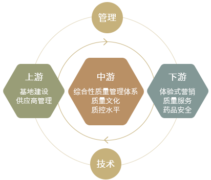 片仔癀药业坚守“良药济世、臻于至善”的核心价值观,在“选材精良、匠心精制、服务精诚、精益求精”质量方针的指引下,以供应链管理理念为指导,以名贵药材可持续发展为核心,实施基于“战略供应链”的全面质量管理模式(如图3.1所示),通过全过程(上游、中游、下游)的质量保证建设,为顾客持续稳定提供优质产品。