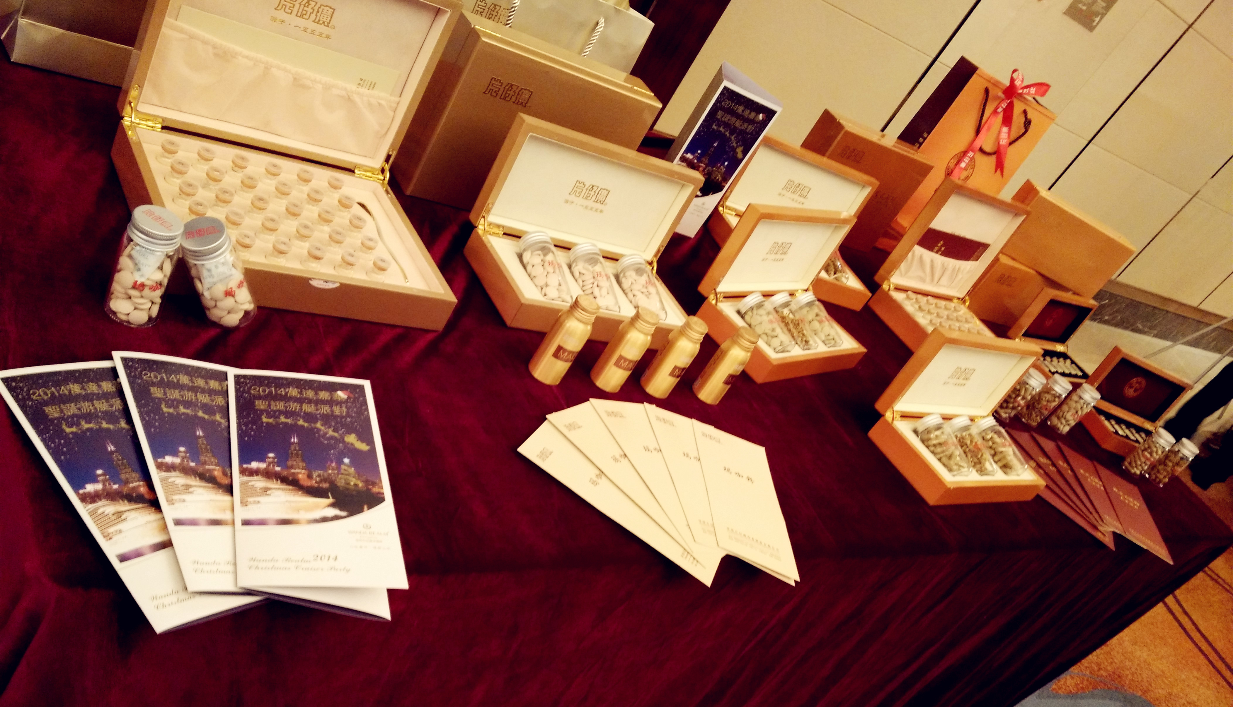 12月24日晚,2014年万达嘉华圣诞游艇派对在万达嘉华酒店3楼顺利闭幕,现场美食佳馔、精彩表演、丰厚大奖吸引了众多私营企业主参加。福建片仔癀保健食品有限公司占据了宴会厅最佳位置,向到场嘉宾展示了片仔癀保健食品公司新产品。