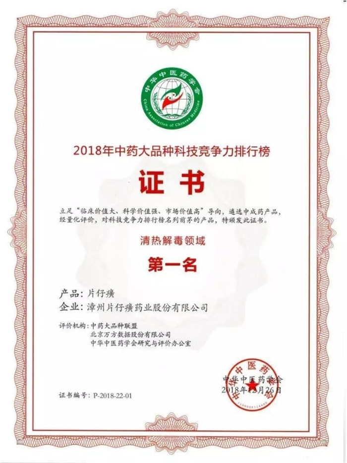 2018年中药大品种科技竞争力排行榜(清热解毒领域)第一名.