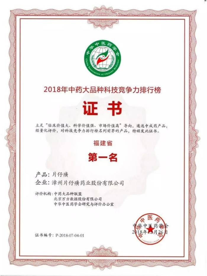 2018年中药大品种科技竞争力排行榜(福建省)第一名