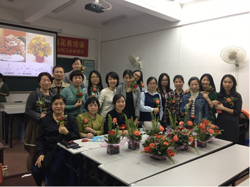 相比于烹饪课活跃的气氛,插花课就比较安静了。这门课程同样有理论讲解和实际操作两个部分。培训的讲师在课上讲的理论逐渐从浅变深,一个晚上实际操作的时间一次比一次长,操作内容也从个人示范慢慢变成学员分组操作。看到自己亲自动手完成的作品,学员们不禁纷纷露出笑容,还带着自己的杰作留下了“全家福”。大家通过这次课程,感受到了插花的乐趣,陶冶了自己的情操,缓解了平日的工作压力,还加强了工作团结力。